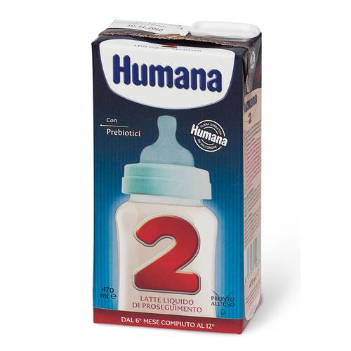Humana 2 LATTE LIQUIDO DI PROSEGUIMENTO Latte di proseguimento con prebiotici GOS (Fibre alimentari bifidogene, a base di galatto-oligosaccaridi). Può essere utilizzato nell’alimentazione del lattante dopo il 6° mese di vita compiuto fino all'anno di età, salvo diversa indicazione del Pediatra. Prodotto confezionato in atmosfera protettiva, sterilizzato UHT. Senza glutine. Ingredienti Acqua demineralizzata; latte scremato; siero di latte demineralizzato in polvere; oli vegetali; maltodestrine; sciroppo di galatto-oligosaccaridi (GOS); lattosio; emulsionante: lecitina di soia; minerali; sciroppo di glucosio; vitamine; taurina; am...