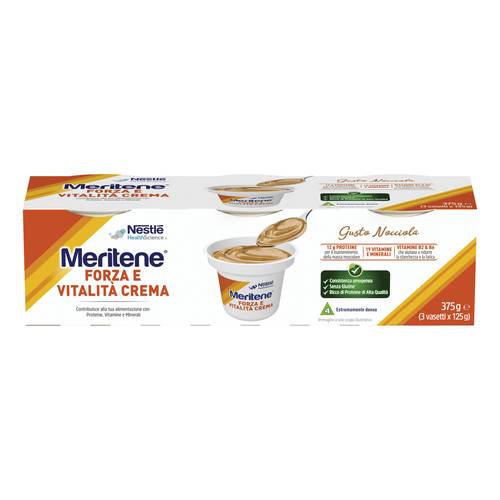 Meritene CremeDescrizione Crema dessert al gusto nocciola, addizionata con vitamine e minerali, ad alto contenuto di proteine, per persone malnutrite o con problemi di deglutizione. E' un dessert iperproteico e ipercalorico, ideale in ogni momento della giornata. E' un alimento indicato per persone malnutrite o con problemi di deglutizione (disfagia), grazie alla consistenza morbida e omogenea. Contiene un elevato contenuto di proteine, ed è arricchito con 19 vitamine e minerali. E' pronto all'uso e può essere assunto come spuntino in ogni momento della giornata. Ingredienti Acqua, proteine del latte (contengono lecitine d...