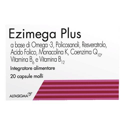 Ezimega Plus Integratore alimentare utile in tutti i casi di ridotto apporto o di aumentato fabbisogno di omega-3 (EPA e DHA), policosanoli, resveratrolo, acido folico, monacolina K, coenzima Q10, vitamina B6 e vitamina B12. Contiene: - EPA e DHA che contribuiscono alla normale funzione cardiaca. Benficio che si ottiene con l'assunzione giornaliera di 250 mg dei due ingredienti. - Monacolina K è estratta dal riso rosso fermentato con il lievito Monascus purpureus. - Vitamina B6 e vitamina B12 che contribuiscono al normale metabolismo dell'omocisteina. Ingredienti Olio di pesce ricco di EPA e DHA, gelatina; agenti di res...