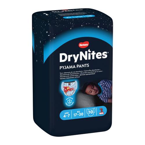 Vedi descrizione completaDryNites Mutandine assorbenti taglia M (4–7 anni/17–30 kg), di aiuto ai bambini che hanno problemi di pipì a letto. Offrono protezione per tutta la notte grazie ad uno strato sottile superassorbente che allontana il bagnato dalla pelle, alle barriere antifuoriuscite e ad un rivestimento esterno impermeabile. Le bande laterali elasticizzate assicurano una vestibilità avvolgente e mantengono il bambino asciutto e comodo per tutta la notte. Grazie ai divertenti disegni personalizzati per bambino e bambina, le mutandine sono molto simili alle mutandine tradizionali.